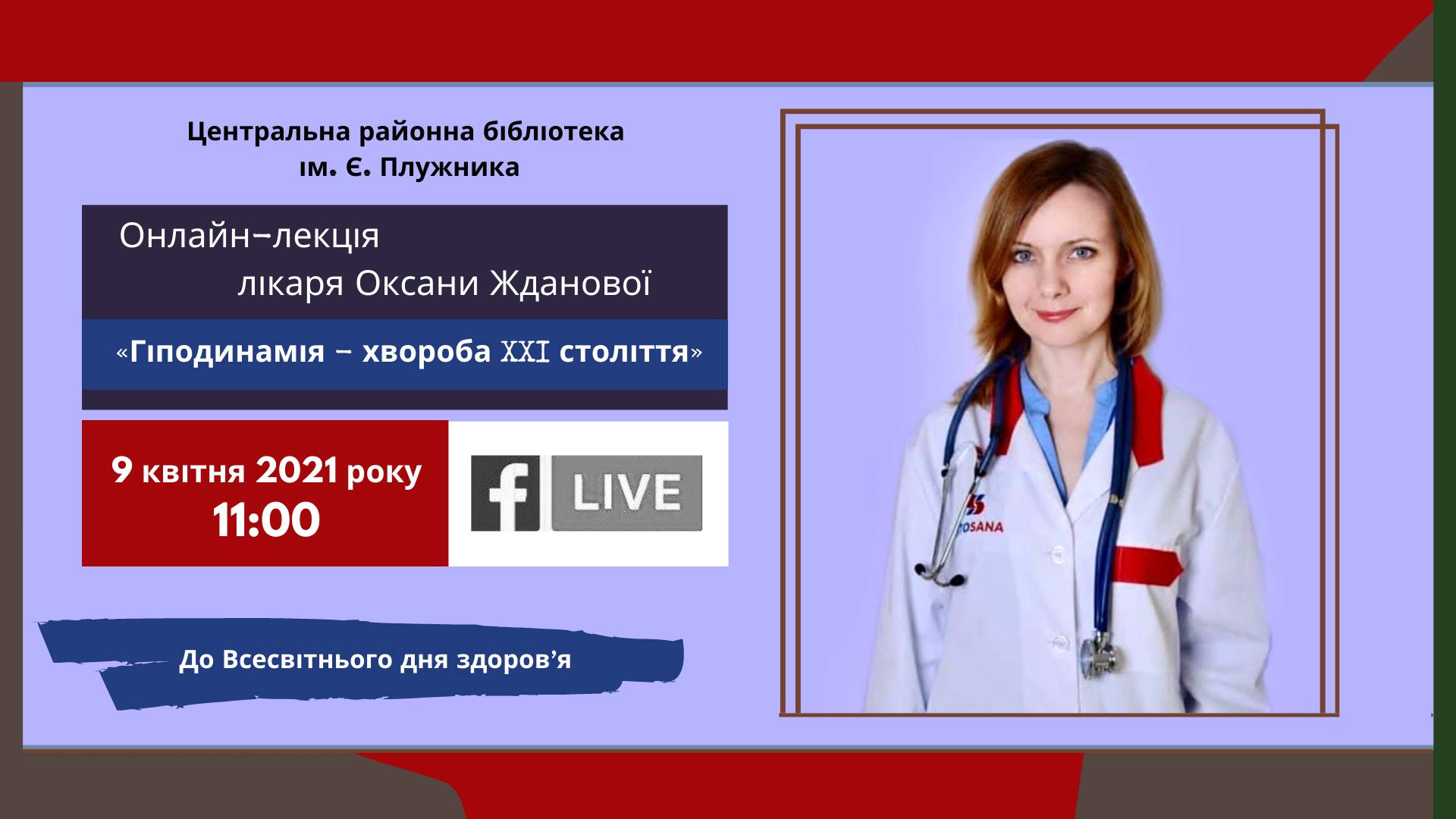 09.04.2021 | Онлайн-лекція лікаря Оксани Жданової «Гіподинамія - хвороба XXI століття» в Центральній районній бібліотеці ім. Є. Плужника