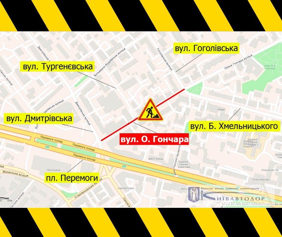 25 квітня на вул. Олеся Гончара частково обмежать рух із 8:00 до 18:00. Про це повідомили у КК «Київавтодор».