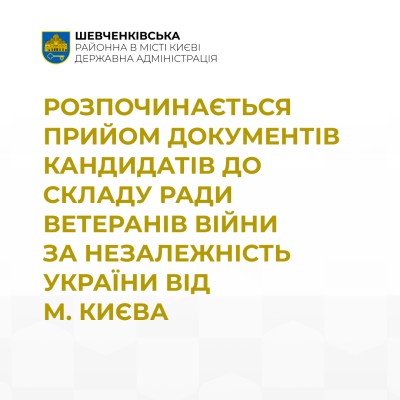 9 квітня 2026 року розпочинається приймання документів кандидатів до складу Ради ветеранів війни за незалежність України від м. Києва в Шевченківській районній в місті Києві державній адміністрації.
