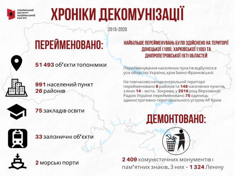 Ухвалення у 2015 році спеціального закону, що засуджує комунізм і нацизм, а також категорично забороняє їх пропаганду як наругу над пам’яттю мільйонів жертв тоталітарних режимів, вивело декомунізацію на повноцінний системний рівень. Перш за все йдеться про усунення комуністичних символів і назв із публічного простору.