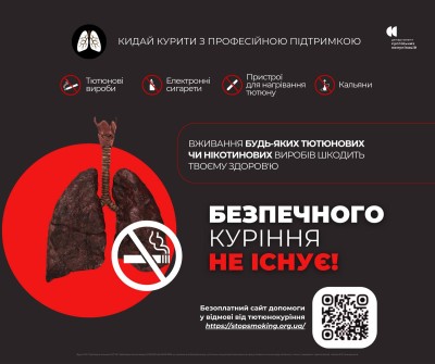 Безпечного куріння не існує – шкоду завдають усі види тютюну та нікотинових пристроїв: сигарети, електронні сигарети, вейпи, системи нагрівання тютюну та кальяни.Кожен крок у бік відмови від куріння – це крок до здоровіших легень, кращого самопочуття та довшого життя.