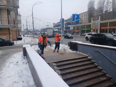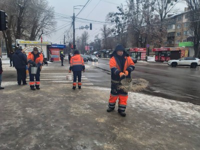 Комунальні служби району працюють у посиленому режимі. Здійснюється очищення проїжджої частини, тротуарів, пішохідних переходів та зупинок громадського транспорту від снігу й льоду, а також протиожеледна обробка покриття з метою запобігання утворенню ожеледиці.