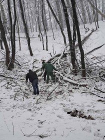 Працівники КП УЗН Шевченківського району проводять обробку тротуарів, сходів і доріжок протиожеледними матеріалами, знімають льодову кірку на небезпечних ділянках, а також виконують обрізку та прибирання аварійних гілок дерев після обледеніння.