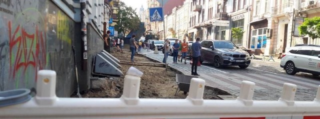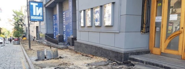 Біля Молодого театру та вище по вулиці Прорізній тривають ремонтні роботи із заміни тротуару. Вже зняли верхню частину старого покриття. Замість асфальту. тут кладуть блоки плитки. Втім, про пішоходів теж подбали - для них огороджена частина дороги.