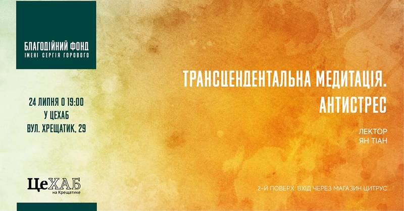 На зустрічі обговорять: що краде нашу увагу та енергію, коли ми цього навіть не помічаємо? що таке справжня усвідомленість і як завдяки регулярній практиці медитації можна навчитись реалізовувати свої бажання і отримувати бажані результати швидко та просто? як за допомогою регулярної практики медитації можна стимулювати мислення і зробити свій розум сильним? у чому особливості техніки трансцендентальної медитації і чому її вважають найпростішою з усіх наявних технік медитації? Лектор – Ян Тіан, сертифікований викладач трансцендентальної медитації і йога-асан Махаріши.