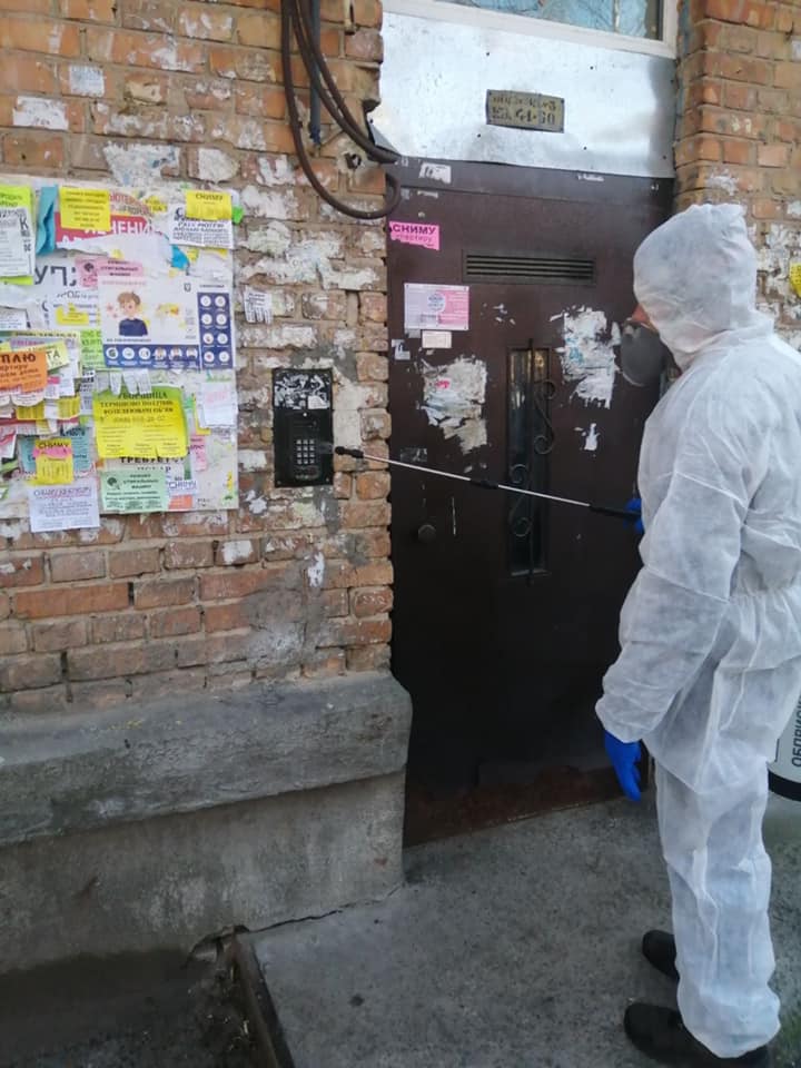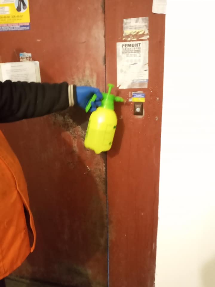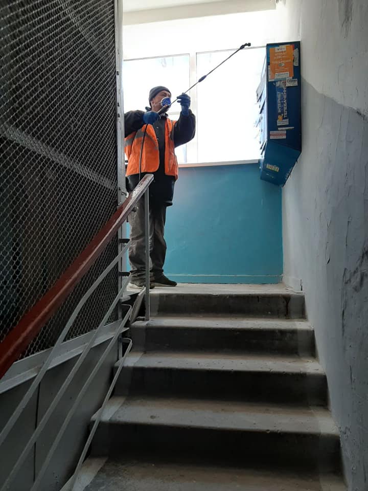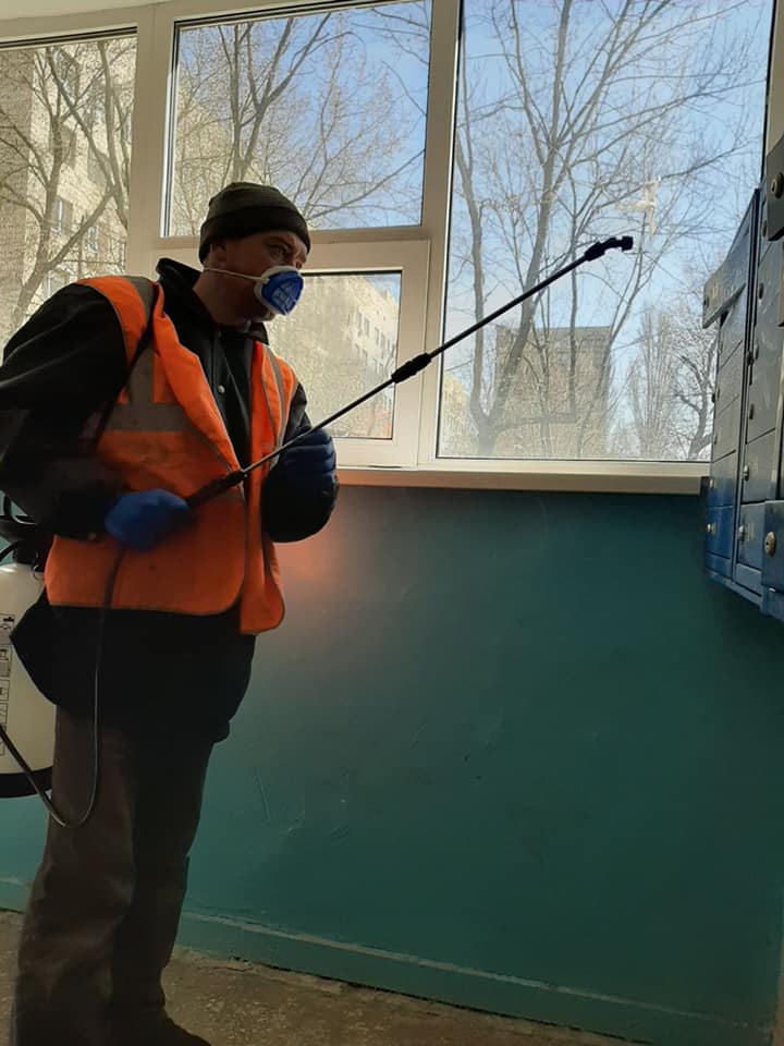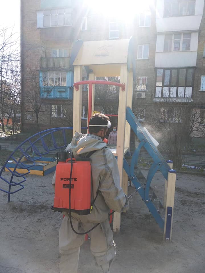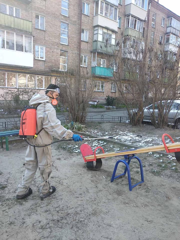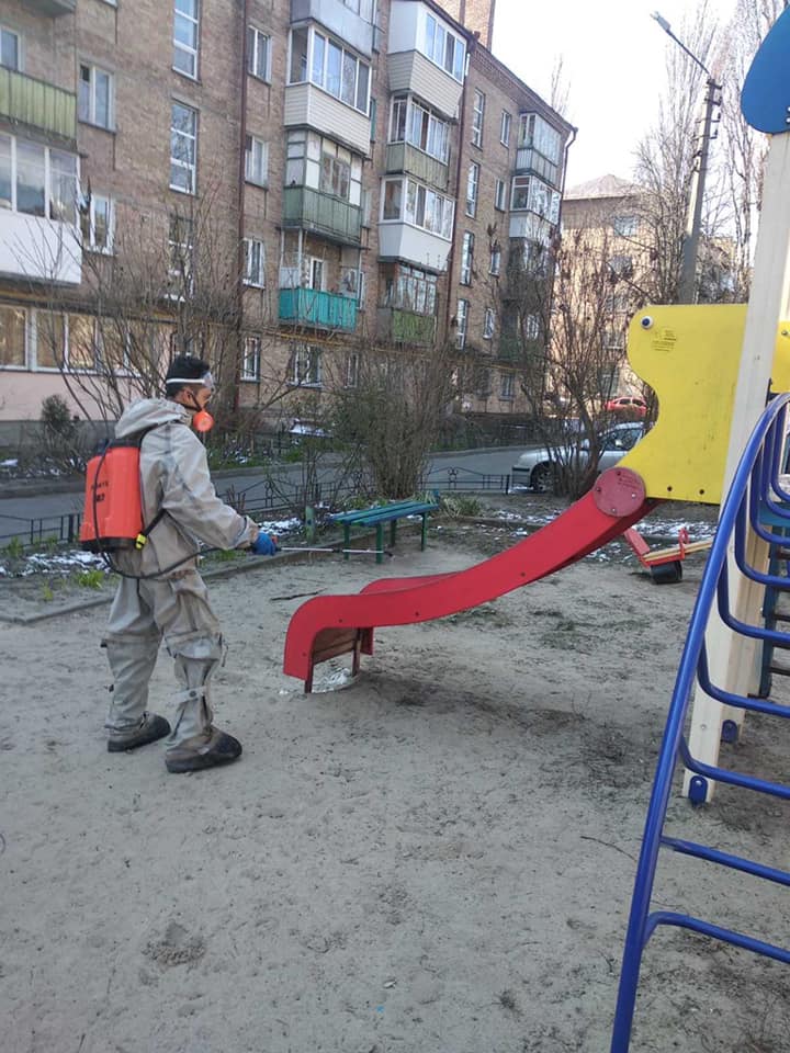Працівники обслуговуючих організацій Шевченківського району міста Києва продовжують роботи по дезинфекціі під’їздів житлових будинків та дитячих майданчиків