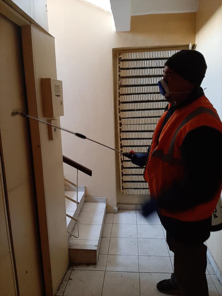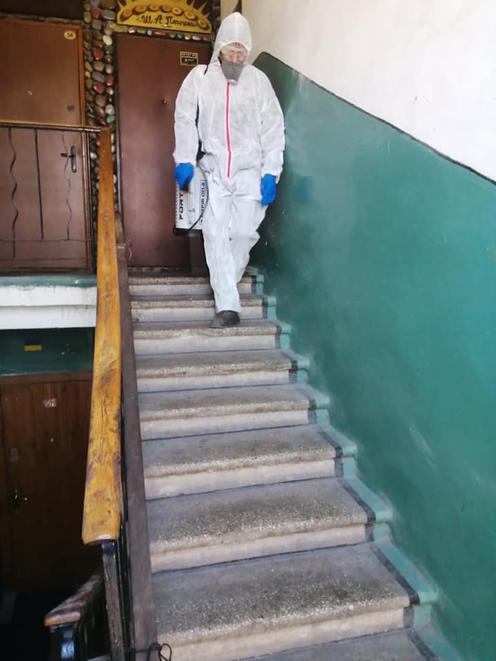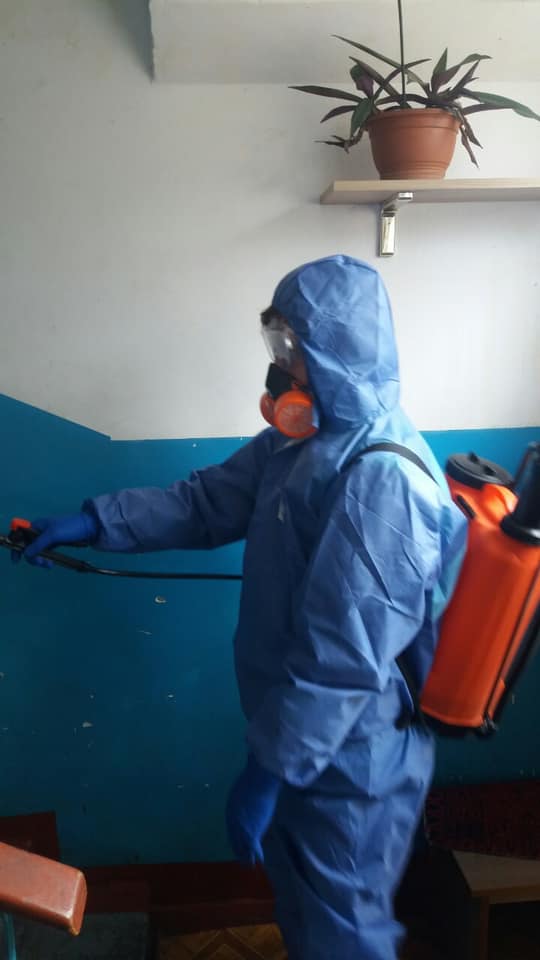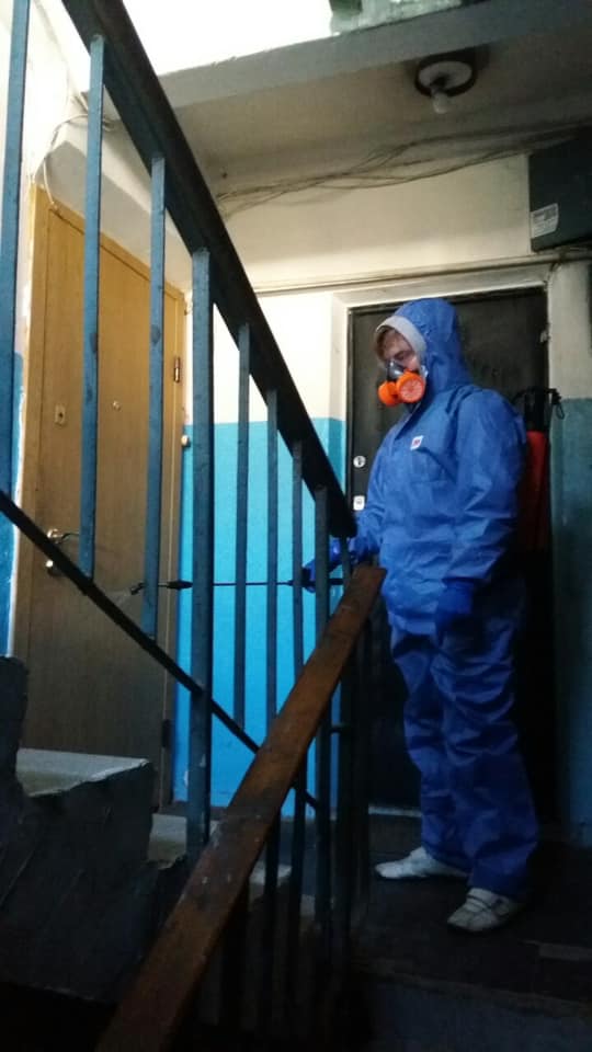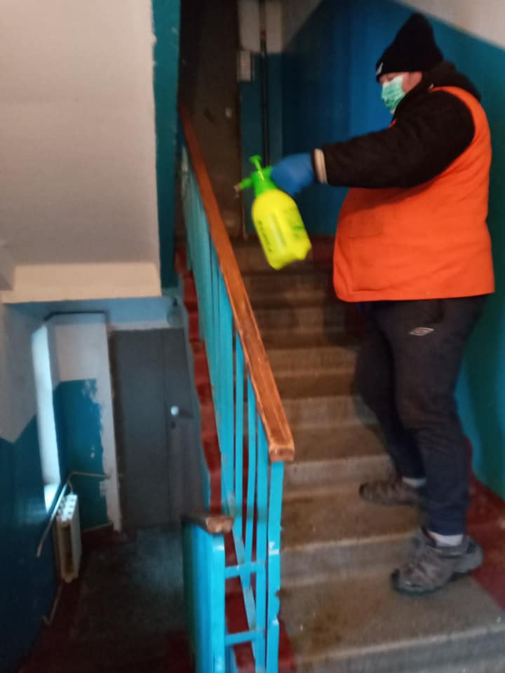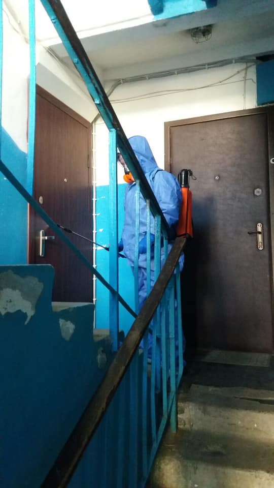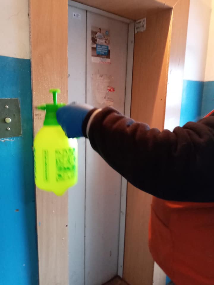 Працівники обслуговуючих організацій Шевченківського району міста Києва продовжують роботи по дезинфекціі під’їздів житлових будинків та дитячих майданчиків