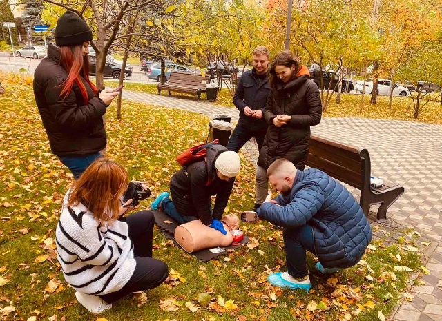 Сьогодні, 21 жовтня, у сквері на вул. Прорізній в рамках проекту «Будь свідомим», який започаткувала ГО «Ротарі клуб «Київ - Столиця» відбувся відкритий майстер - клас з надання першої медичної допомоги.