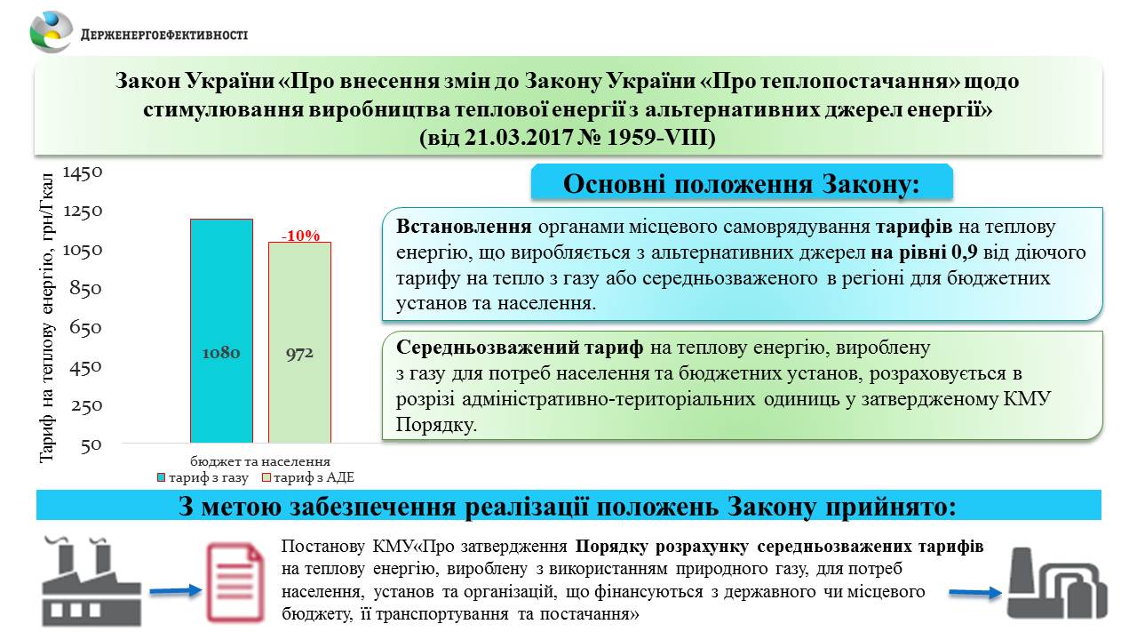 Відповідно до Закону України від 21.03.2017 №1959-VIII зазначені середньозважені тарифи щоквартально, до 25 числа останнього місяця кварталу, розраховуються Держенергоефективності за інформацією НКРЕКП та органів місцевого самоврядування у порядку, затвердженому Урядом.