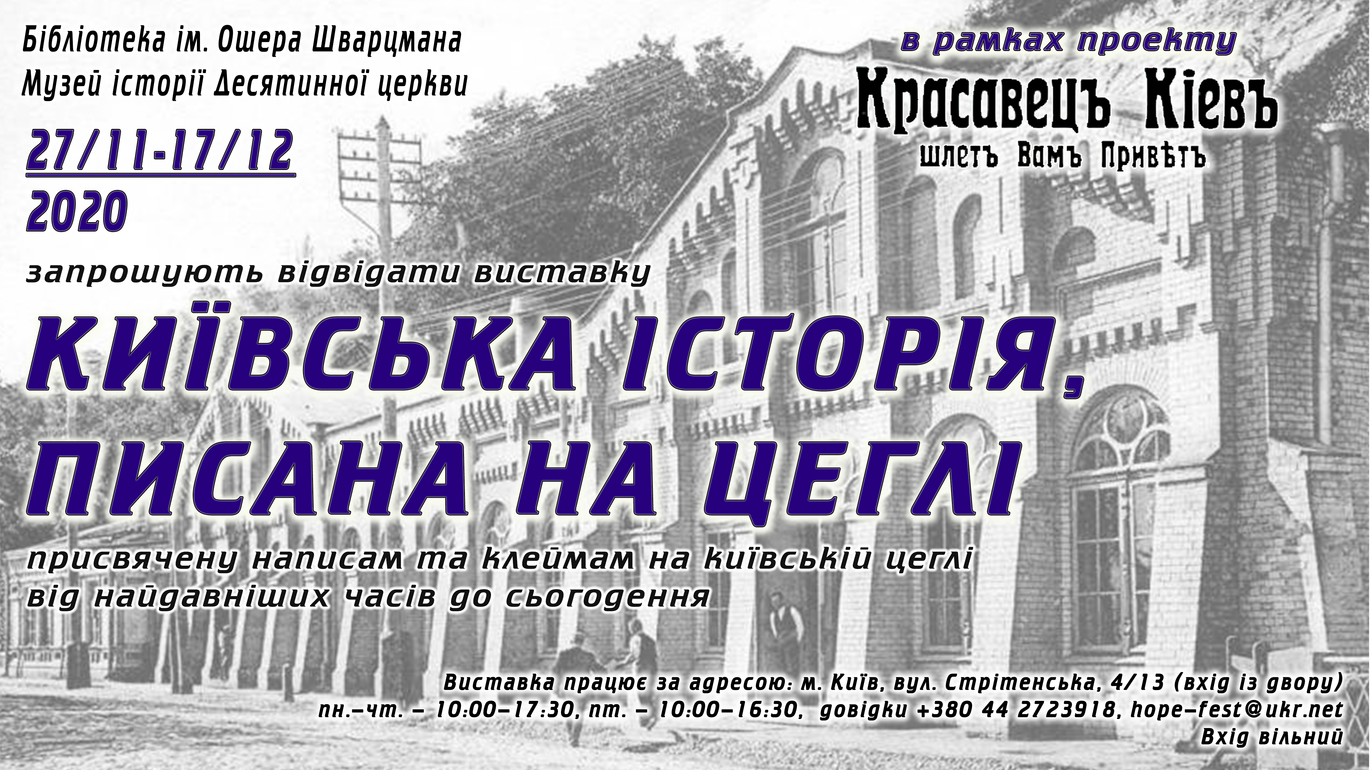 Виставкою "Київська історія, писана на цеглі" бібліотека ім. Ошера Шварцмана і Музей Історії Десятинної Церкви розпочинають новий проект "Красень Кієвъ шле Вам привіт" - цикл виставок і зустрічей, присвячених нашому чудовому місту.