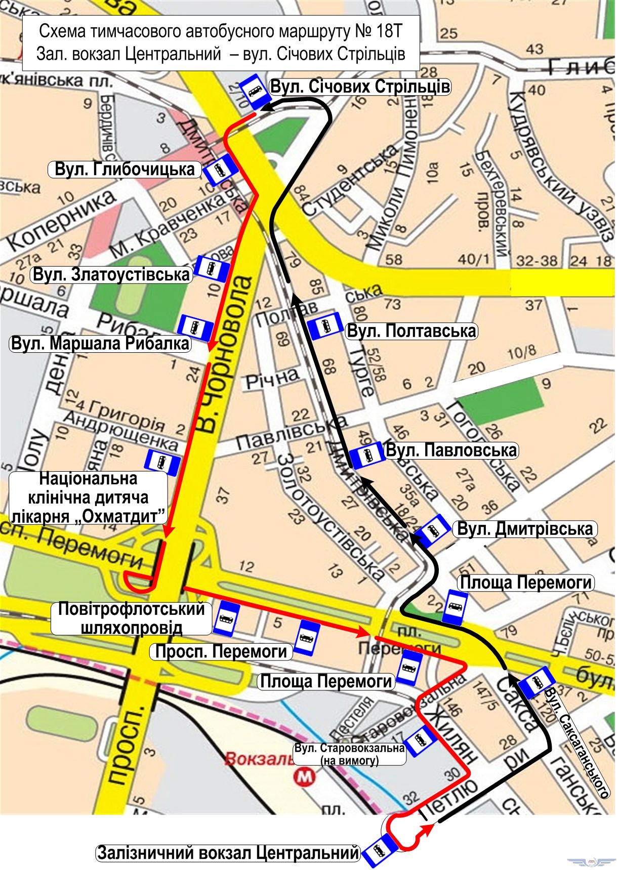 Роботу тимчасового автобусного маршруту №18 «Залізничний вокзал Центральний – вулиця Січових Стрільців» організовано по трасі: вул. Симона Петлюри – вул. Саксаганського – пл. Перемоги – вул. Бульварно-Кудрявська – вул. Дмитрівська – вул. В’ячеслава Чорновола – Глибочицький проїзд – вул. Глибочицька – вул. Січових Стрільців – вул. В’ячеслава Чорновола – просп. Перемоги – пл. Перемоги – вул. Старовокзальна – вул. Жилянська – вул. Симона Петлюри.